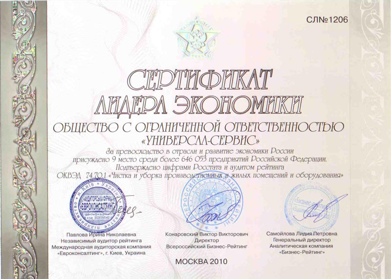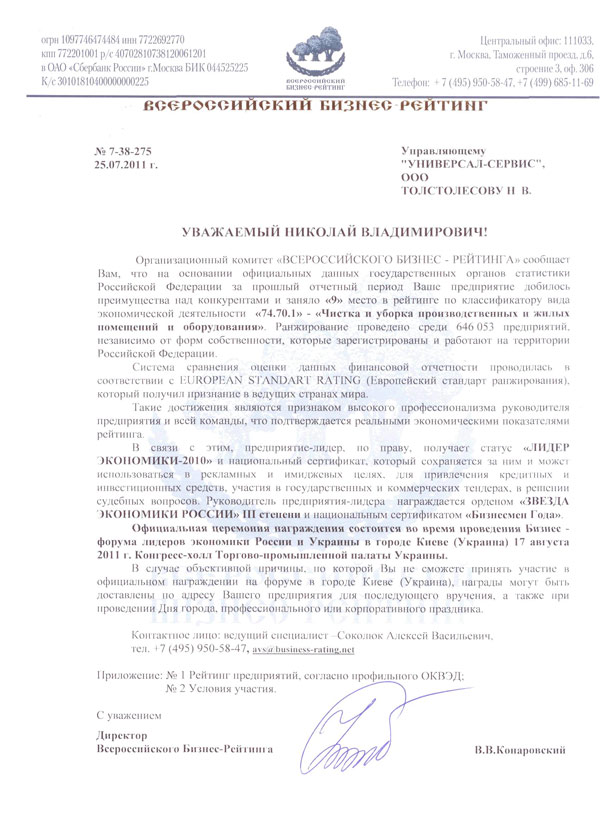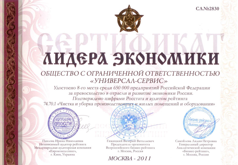 Перспективы качественной работы для нас важнее сиюминутной выгоды. И с кем бы мы ни работали, мы всегда помним о высокой степени ответственности за проделанную работу. «Универсал-Сервис» является и стремится быть лидером рынка с хорошо проработанной технологией оказания высококачественных услуг, с чёткой кадровой политикой и системой обучения, с характерной для нас открытостью, оперативностью, помощью в решении любых выше перечисленных вопросов. Мы ставим себе задачу: соответствовать самым высоким стандартам качества услуг, удобства, надёжности и безопасности и успешно её выполняем. Мы стремимся, чтобы клиенты «Универсал-Сервис» получали наилучший сервис, и наивысшей оценкой качества и надёжности нашей работы служили добрые отзывы наших клиентов, на деле оправдывая принцип "Лучшие рекомендации - наши дела".